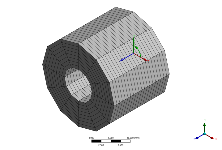 [그림 3]은 Ansys Mechanical에서 General Axisymmetric 기능을 활성화한 화면으로, 축대칭 단면이 θ 방향으로 확장되며 Nodal Plane이 생성되는 구조를 보여준다. Symmetry 탭에서 General Axisymmetric을 선택하면 해당 기능이 적용되며, Details 창에서 회전축 정의, 좌표계 지정, Nodal Plane 수 등을 설정하여 3차원 거동을 구성할 수 있다. Nodal Plane 수는 단면(Base Element)을 θ 방향으로 복제하는 개수이며, 이는 해석에 포함되는 모드 수와 직접적으로 연관된다. Nodal Plane 수가 많을수록 더 높은 차수의 비대칭 변형을 표현할 수 있으며, 현재 Ansys에서는 최대 12개까지 지원된다.