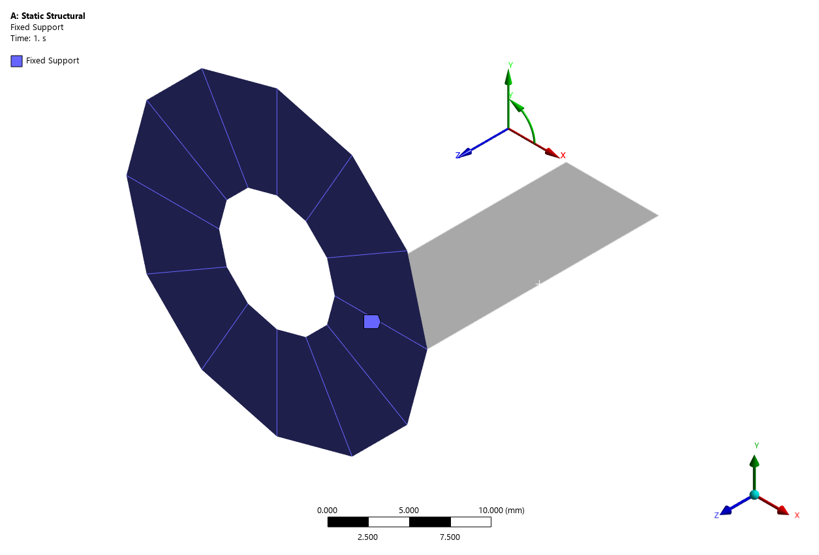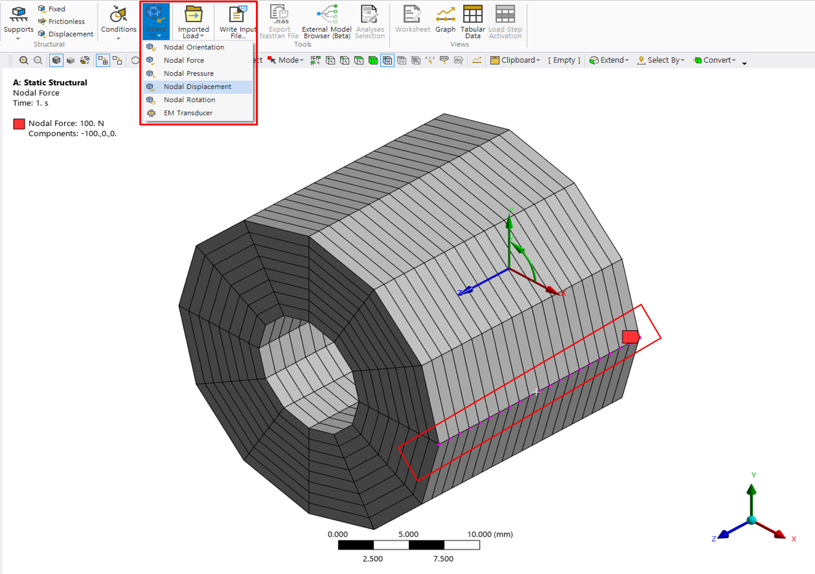 [그림 5] 축대칭 단면 Edge에 적용된 Fixed Support비대칭 하중이나 편심 조건과 같이 Geometry 기반 입력만으로는 표현이 어려운 하중 조건은 Direct FE 방식을 사용하여 Node 단위로 하중 또는 구속 조건을 지정할 수 있다. [그림 6]은 특정 Node에 하중을 직접 입력하는 예를 나타낸 것이다.