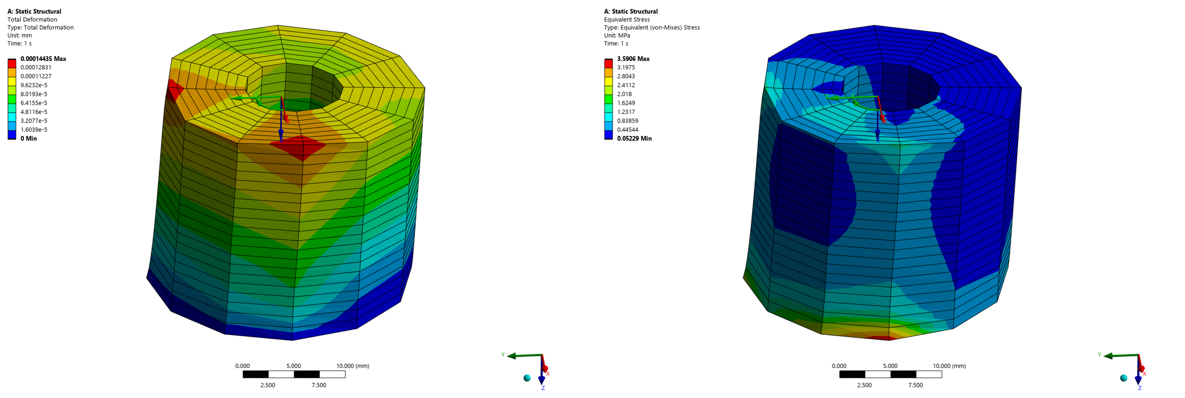 [그림 7]은 전체 변형 및 응력 분포 결과를 나타내며, 원주 방향으로 균일하지 않은 하중 조건이 구조 응답에 그대로 반영된 것을 확인할 수 있다. 이는 단면 기반 모델임에도 실제 3차원 구조 거동을 효과적으로 재현할 수 있음을 보여준다.
