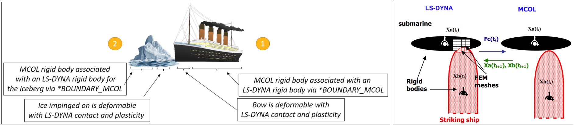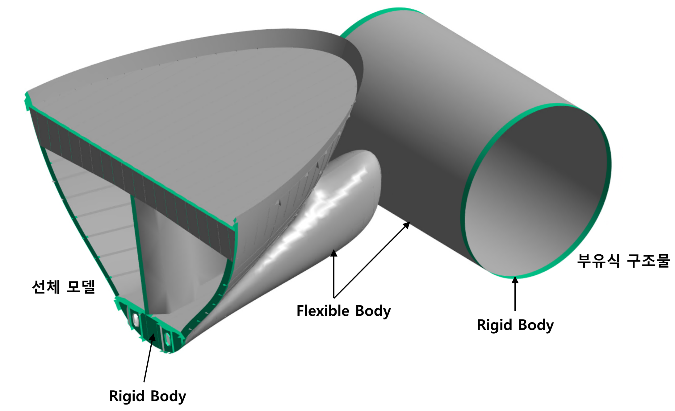 해상에서 선박과 부유식 구조물, 또는 다른 선박, 암초와의 충돌 메커니즘에서는 내부의 충돌 메커니즘(inner collision mechanics)과 외부의 충돌 동역학(outer collision dynamics)으로 구분되며, 정확한 선박의 충돌 거동 도출을 위해서는 이 둘을 모두 고려한 해석을 수행하여야 한다. 내부 충돌 메커니즘은 좌굴, 재료 항복 및 탄/소성, 재료 파단 등의 구조적 거동 특성이 포함되므로 선박 모델의 충돌이 발생하는 영역에 유연체(flexible body)로 모델을 구성하여야 하며, explicit solver인 LS-Dyna를 이용하여 선박 충돌(충격력)을 계산하게 된다. 외부의 충돌 동역학은 선박 또는 부유체 모델에 대해 모두 강체(rigid body)로 적용을 한 후 선박 또는 부유체 모델의 질량, 무게 중심 및 고유 특성과 유체 하중을 고려한 해석을 진행하게 되며, hydrodynamic solver인 Aqwa를 이용하여 운동 특성 계산을 진행한다. 이는 선박 또는 부유체의 부력, 중력, 압력으로 인한 하중이 포함되며, 이 결과가 포함된 LS-Dyna와 연동된 MCOL에 의해 선박의 충격 거동이 계산된다. 또한, Hydrodynamic 효과인 added mass matrix, frequency-dependent damping matrix 등도 Ansys Aqwa를 통해 계산되어 선박 충돌 해석에 반영된다. 선박의 충돌 해석 모델은 [그림 1]처럼 Ansys S-Dyna에서 선박 및 부유체 모델 내 충돌하는 각 국부 영역은 유연체 모델로 구성하였고, 나머지 영역은 강체 모델로 구성하였으며, MCOL에서는 모든 모델이 강체로 구성하였음을 확인할 수 있다.