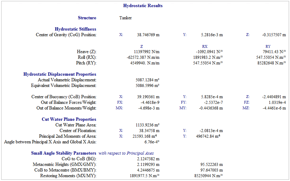 Hydrodynamic diffraction 계산이 완료되면, ‘Hydrostatic Result’를 추가하여 [그림 8]과 같이 선박의 부심 및 무게 중심과 ‘Cut Water Plane Properties’, ‘Small Angle Stability’ 변수 등을 출력하여 확인할 수 있다.