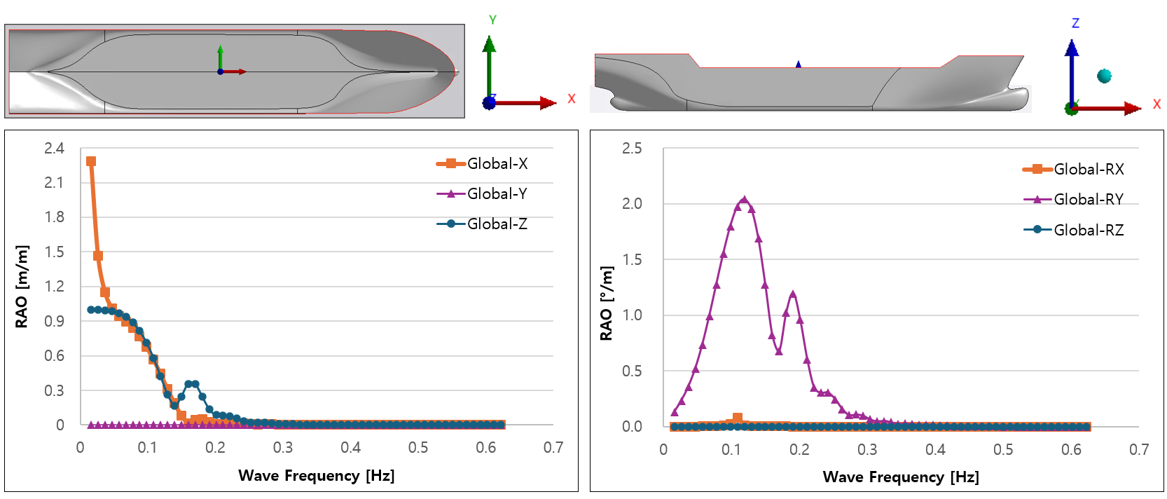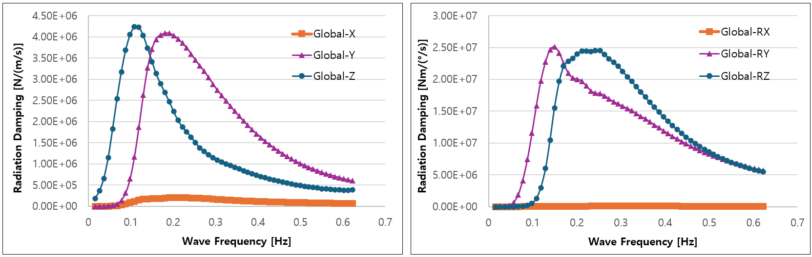 [그림 9]는 -180° 방향의 wave에 대한 선박의 RAO를 자유도 별로 나타내고 있으며, [그림 10]에서는 -180° 방향의 wave 및 주파수에 대한 자유도 별 radiation damping을 나타내고 있다.