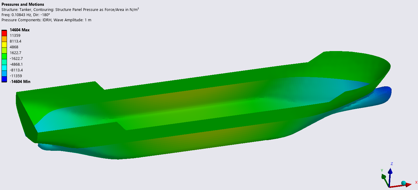 위와 같이 정의한 해양 구조물에 충돌할 선박의 질량, 무게 중심, 관성모멘트 및 설정한 해석 세팅을 기반으로 hydrodynamic diffraction 계산을 진행한다.