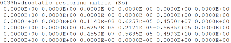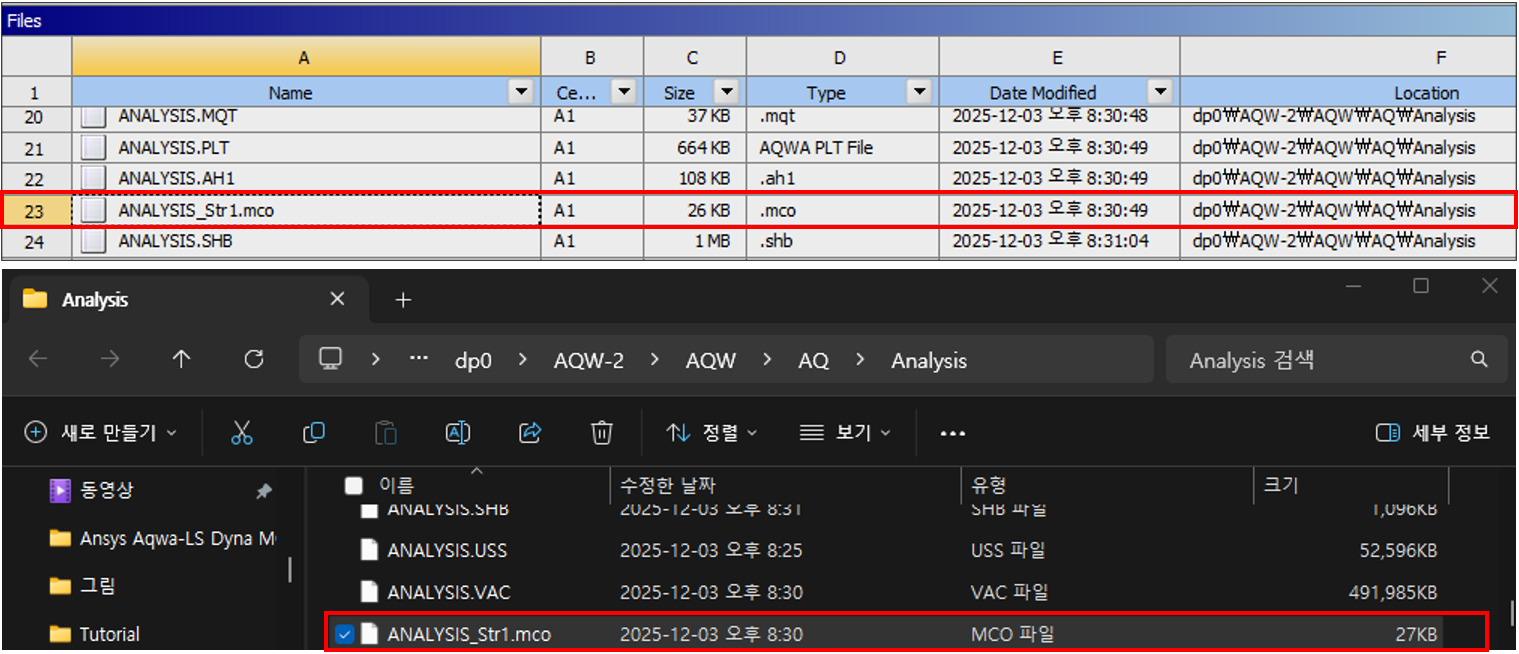 ‘MCOL Hydrodynamic Database’ 항목을 ‘Yes’로 설정(2025R2 기준) 후 ‘Hydrodynamic Diffraction’ 계산이 완료되면, 아래 [그림 12]와 같이 ANALYSIS_Str1.mco 파일이 자동으로 생성되었음을 확인할 수 있다. ANALYSIS_Str1.mco 파일 내에는 [그림 13~15]와 같이 선박의 총 중량인 Mass Matrix, Hydrostatic Restoring Matrix, Add Mass Matrix, Buoyancy Reference Parameter 등과 같은 MCOL 계산에 필요한 주요 데이터들이 포함되어 있다. 질량 행렬은 Aqwa 내 모델 상의 입력한 총질량을 기반으로 계산하여 출력하게 되고, MCOL 형식에 맞게 Aqwa 내에서 정수 정적 강성을 재계산하여 정수 정적 복원 행렬을 출력한다. 또한, MCOL에 필요한 부력 매개 변수는 Aqwa의 수면 기준으로 정의된 선박의 위치에 따라 영향받게 되는데, 이 부력 매개 변수도 Aqwa에서 계산되어 ANALYSIS_Str1.mco 파일에 포함되고, 부가질량 행렬도 계산하여 MCOL 좌표계에 맞춰 변환 및 출력이 된다.