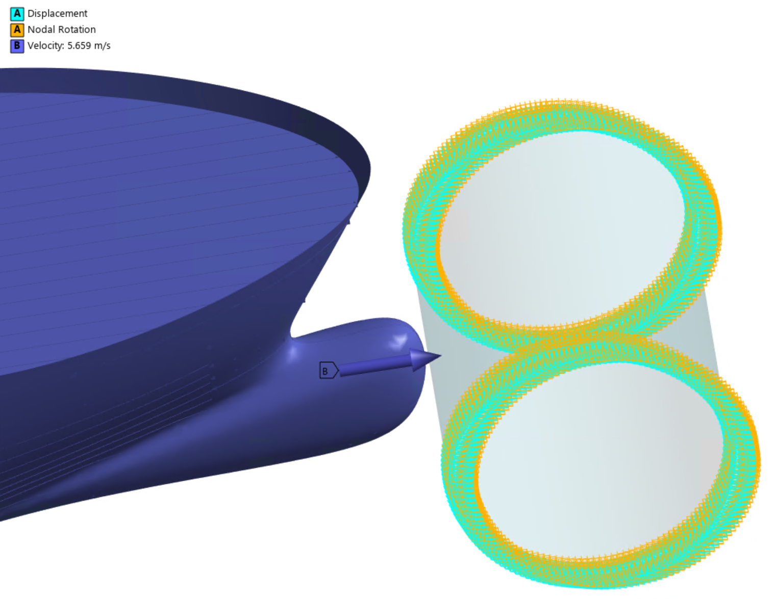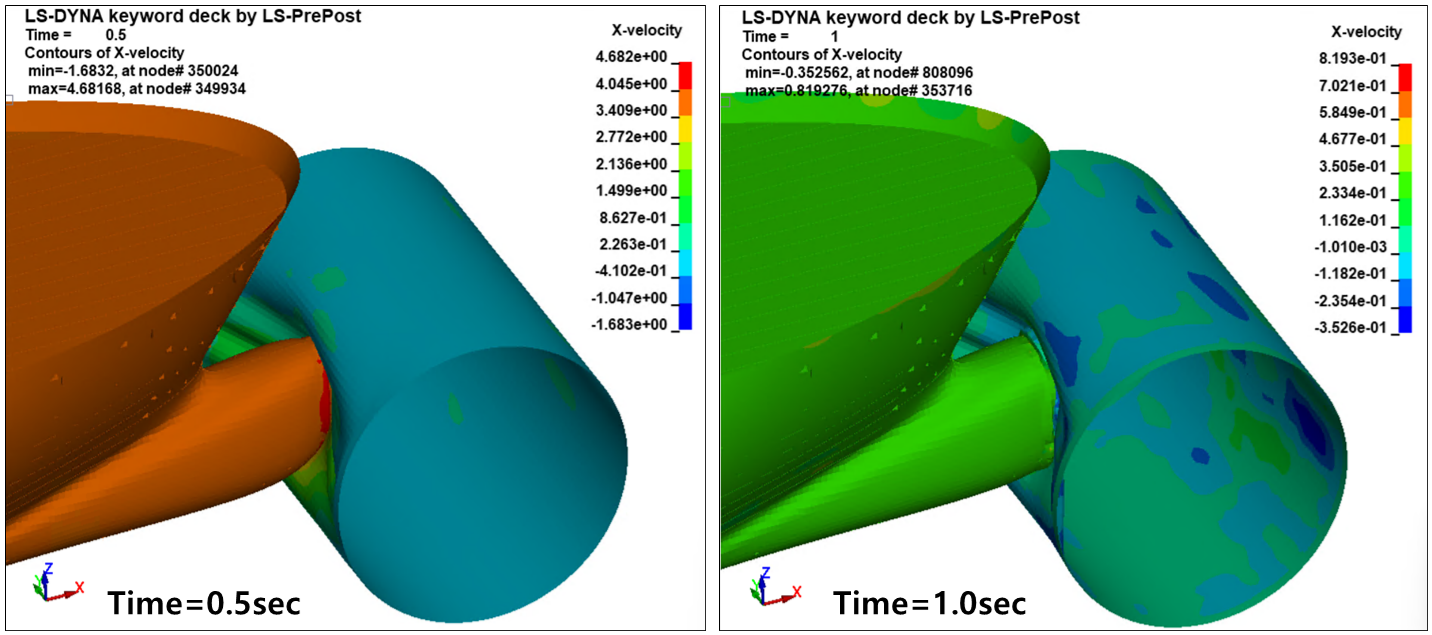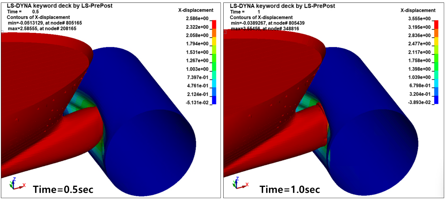Ansys LS-Dyna/MCOL Solver를 이용하여 선박이 고정식 실린더 구조물에 1초간 충격이 가해진 해석을 완료한 후 해석 결과는 LS-Prepost로 확인하였다. 그림 19는 선박과 고정식 구조물과 충돌을 하면서 각 0.5초 및 1초 시의 Displacement 결과를 나타내고 있다. 실린더 구조물 양끝단이 구속되어 있으므로 밀려나는 강체 거동은 발생하지 않으며, 유연체 영역인 중심부는 찌그러지는 변형이 발생하고 있으며, 선박은 1초간 부유체 모델과 충돌하며 3.5m 가량 밀려 이동하였음을 확인할 수 있다.