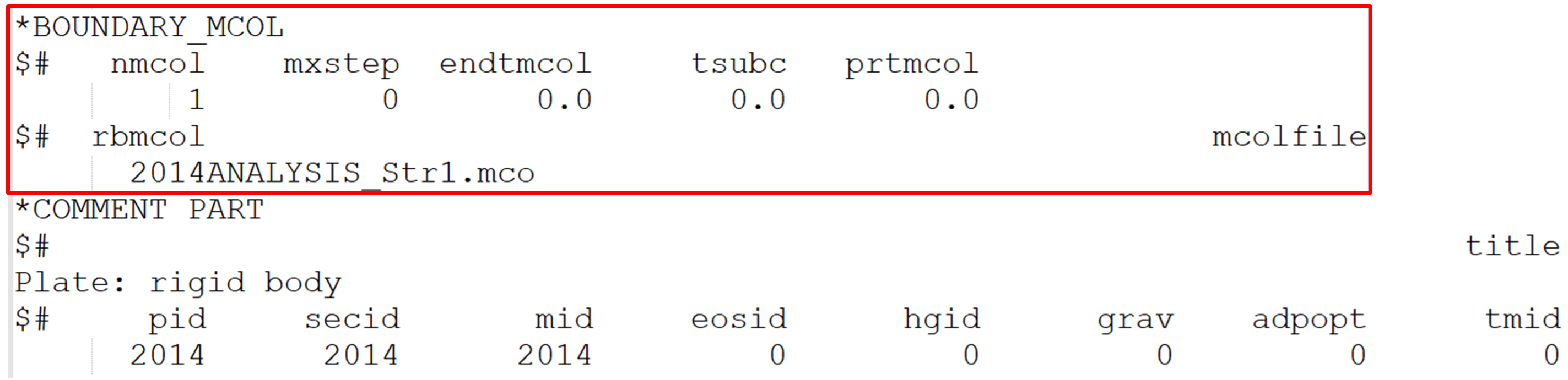 Ansys LS-Dyna 해석을 위해 구성한 k파일 내에 MCOL은 아래의 그림과 같이 *BOUNDARY_MCOL에 위치하고 있으며, MCOL Solver는 Aqwa에서 계산 후 도출한 ANALYSIS_Str1.mco을 이용하여 선박의 주요 데이터들을 이용하여 선박의 충돌 계산을 진행하게 된다.