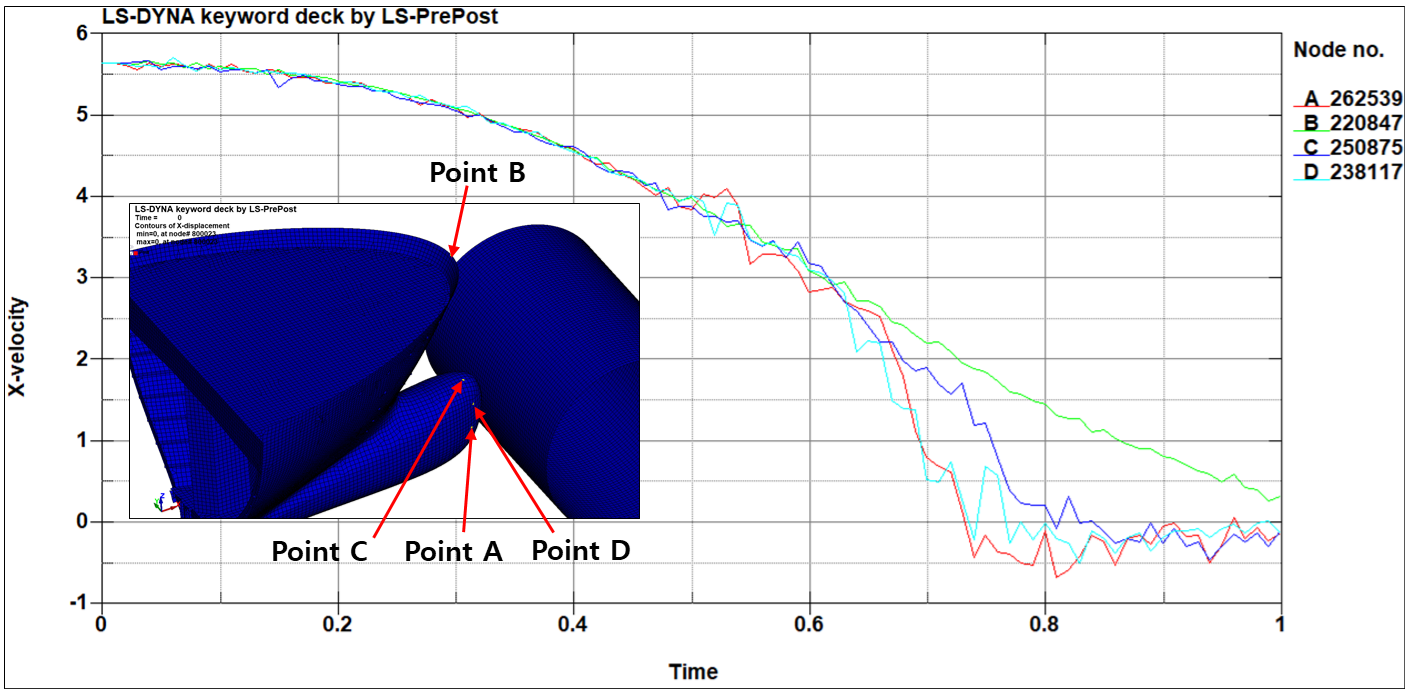 [그림 20]은 각 시간에 따른 선박의 속도를 나타내고 있으며, [그림 21]은 선수 영역의 각 위치별 시간에 따른 속도 변화를 그래프로 나타내고 있다. 초기 속도 5.659m/s에서 해양 구조물과 충격이 발생하는 시점부터 급격히 속도가 감소하여 선박 하부 영역은 구조물 방향으로 밀고 들어가다 0.75초에 멈추거나 뒤로 밀려나는 거동을 확인할 수 있다.
