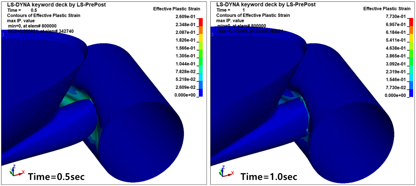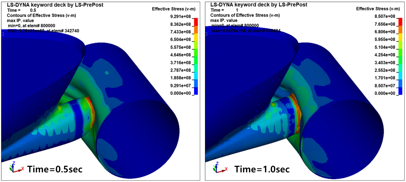 [그림 22]는 0.5초와 1초일 때의 선박 및 고정식 실린더 구조물의 equivalent plastic strain 결과를 나타내고 있다. 충격이 가해지는 선박의 하부 구조물과 영구 변형이 크게 발생하는 실린더 구조물의 중심부 영역에서 높은 소성 변형률이 발생함을 확인할 수 있으며, 이 영역에서 파손이 발생하거나 중심을 잃고 선박이 좌초될 가능성이 높을 것으로 보인다. [그림 23]은 선체와 고정식 구조물의 0.5초, 1초일 때의 Von-Mises 응력을 나타내고 있으며, 선수 하부와 충격이 발생하는 구조물 표면에 높은 응력이 발생함을 확인할 수 있다.