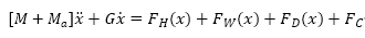 선박의 충격 운동 거동을 정확히 구현하기 위해 파랑, 감쇠, 복원력, 점성 효과를 포함한 운동 방정식이 필요하며, 아래와 같이 표현하였다. MCOL 내에서 아래의 운동 방정식을 구성하여 newmark 기법을 이용한 시간 영역 해석을 수행하고, 계산된 위치, 속도, 가속도 정보를 MCOL과 LS-Dyna간에 단계적으로 교환하며, 선박의 충돌 계산을 진행하게 된다.