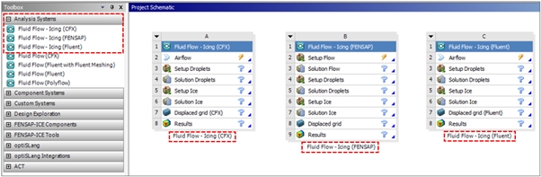 Fluid Flow – Icing은 Ansys Workbench Toolbox에서 확인할 수 있다. 사용자가 Airflow Solver를 선택할 수 있으며 Airflow Solver에 따라 Fluid Flow - Icing(CFX / FENSAP / Fluent) 중에 하나를 선택하여 [그림 2]와 같이 구성한다.