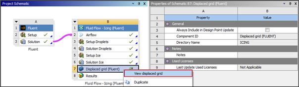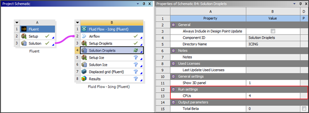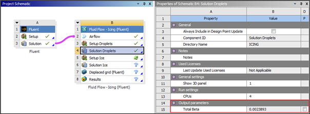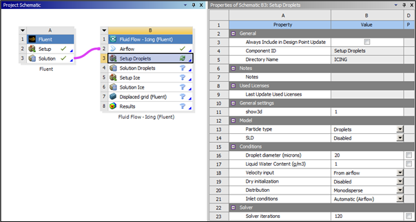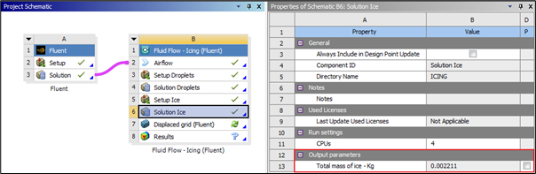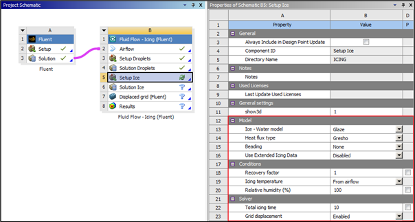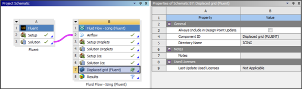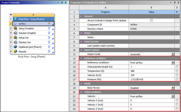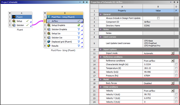 [그림 4]와 같이 Project Schematic에서 기수행한 Fluent의 유동해석 결과를 Fluid Flow – Icing(Fluent)의 Airflow에 연결하고, Airflow를 Update하여 Fluent에서 사용한 Refence conditions과 Initial conditions을 Properties of Schematic에서 확인한다.