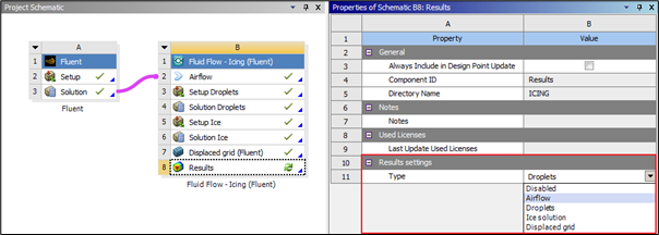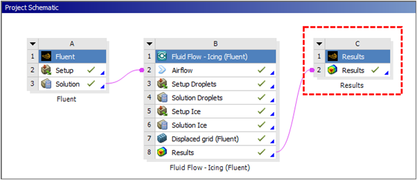 Results settings에서 Type을 설정 후, [그림 16]과 같이 Fluid Flow – Icing Results와 Results component를 연결하여 CFD-Post에서 결과를 확인한다. [그림 17]