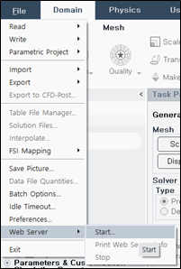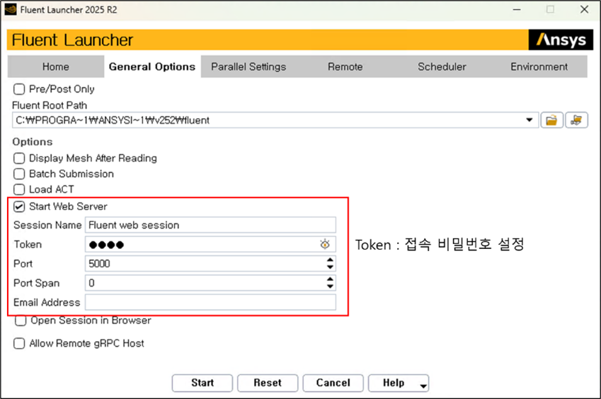 1. Fluent Launcher 실행 → General Options → Start Web Server [그림 1] 2. Fluent Meshing 또는 Solver Mode 실행 후 File > (Application) > Web Server > Start .. [그림 2] |