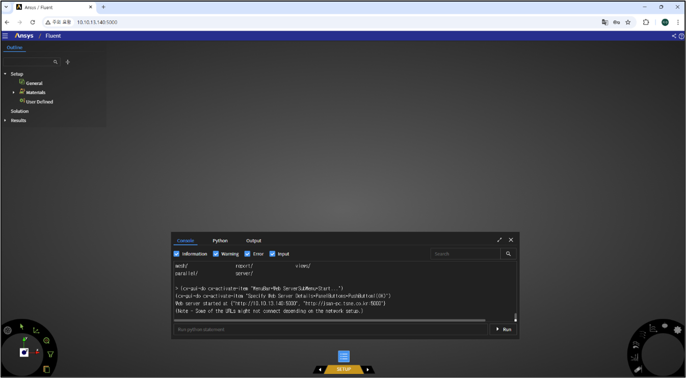 Web UI는 [그림 4]와 같이 Fluent의 기능 구조에 Ansys Discovery 특유의 직관적인 인터페이스 요소가 결합된 형태로 구성되어 있다. 하단 Console 영역에는 Python, Output 탭이 함께 제공되며, GUI 작업과 Python Script 상태를 함께 확인할 수 있다. 또한 Web UI에서 변경한 설정은 Local Fluent에도 동일하게 반영된다.