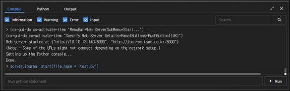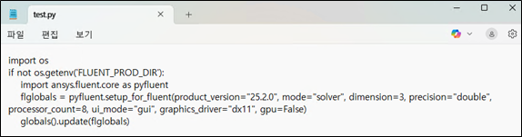 Recording을 통해 생성된 Python Script는 Fluent에서 File > Read > Journal 기능을 이용해 반복 실행할 수 있다. 또는 더 나아가 Python IDE를 이용하여 편집하거나 다른 Python Module과 결합하여 확장 활용할 수 있다.