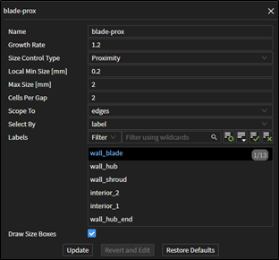 workflow.TaskObject['Add Local Sizing'].Arguments.set_state({r'AddChild': r'yes',}) workflow.TaskObject['Add Local Sizing'].Arguments.set_state({r'AddChild': r'yes', r'BOIControlName': r'blade-prox',}) … workflow.TaskObject['Add Local Sizing'].Arguments.set_state({r'AddChild': r'yes', r'BOIControlName': r'blade-prox', r'BOICellsPerGap': 2, r'BOIExecution': r'Proximity', r'BOIFaceLabelList': [r'wall_blade'], r'BOIMaxSize': 2, r'BOIMinSize': 0.2, r'BOIScopeTo': r'edges',}) |