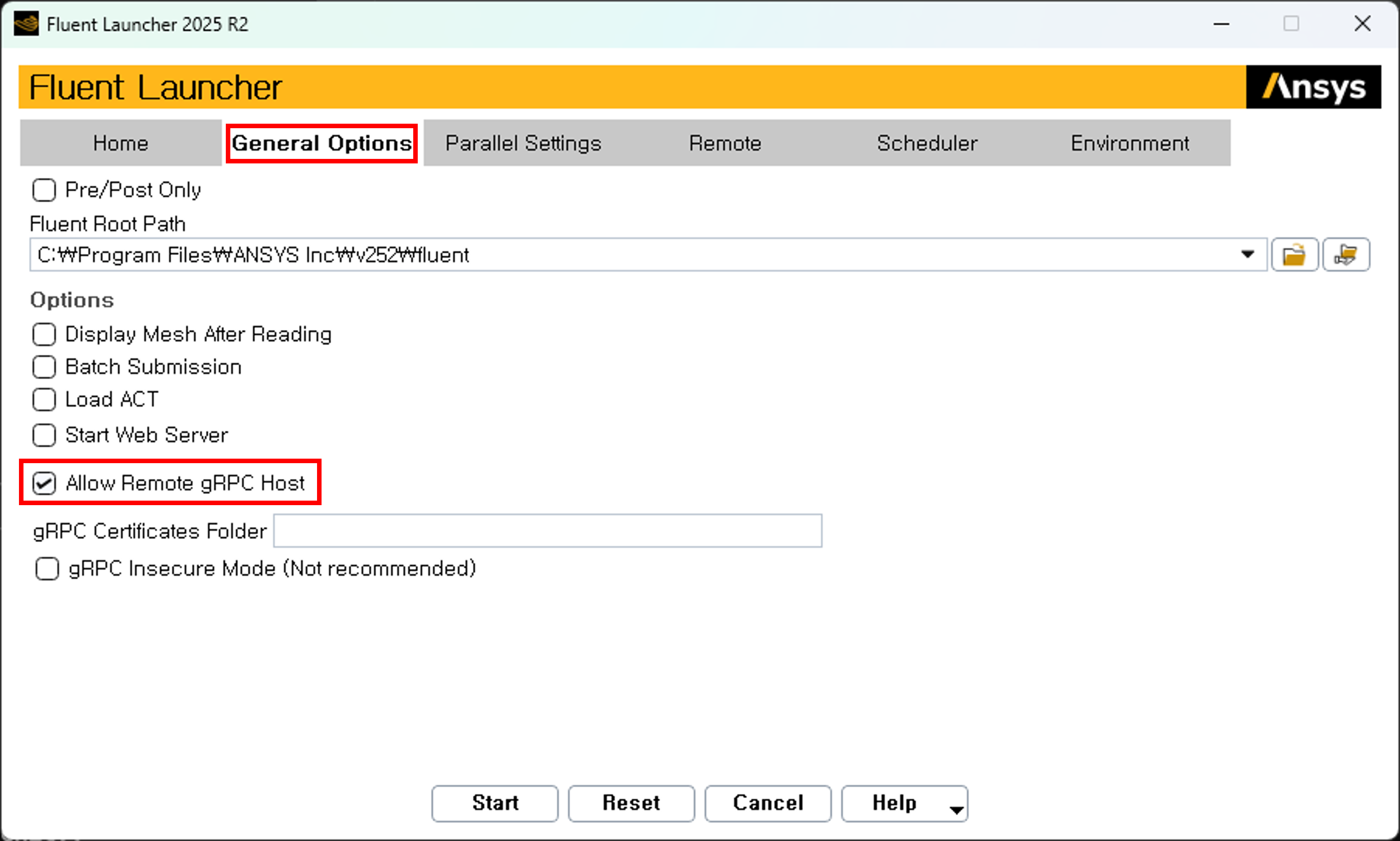 Allow Remote gRPC Host는 Fluent Launcher창[그림2]의 “General Options” 탭에서 Allow Remote gRPC Host를 켜게 되면 [그림3]과 같이 Fluent가 수행된 PC가 아닌 외부 PC와 통신이 가능해진다. 이때, 네트워크를 통하게 되면 보안에 취약해질 수 있기 때문에 gRPC Certificates Folder 옵션이 제공된다.