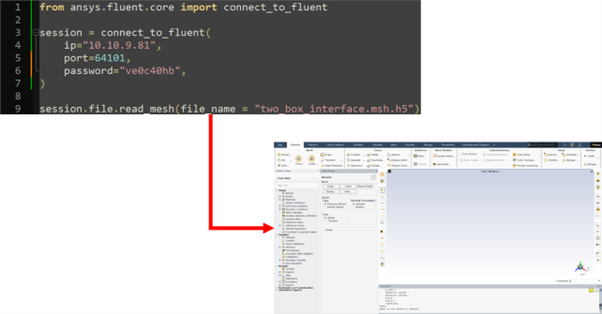 원격 PC에서 Fluent gRPC 서버에 접속하기 위한 PyFluent API는 connect_to_fluent이다. [그림6]과 같이 인자로 Serverinfo 파일의 IP, Port, Password를 기입해 주면 실행된 Fluent gRPC 서버에 접속이 되고 사용자는 원격상태에서 PyFluent를 사용하여 Fluent를 제어할 수 있다.