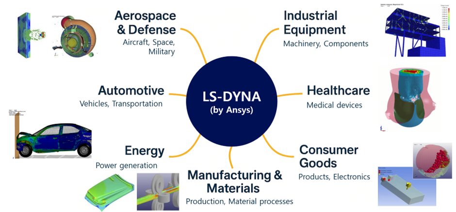 LS-DYNA는 자동차, 항공, 방산, 제조, 의료, 원자력 등 다양한 분야에서 활용되고 있다. Explicit(외연적) 및 Implicit(내연적) 기법을 이용한 비선형 해석을 수행하는 강점을 가지고 있다.