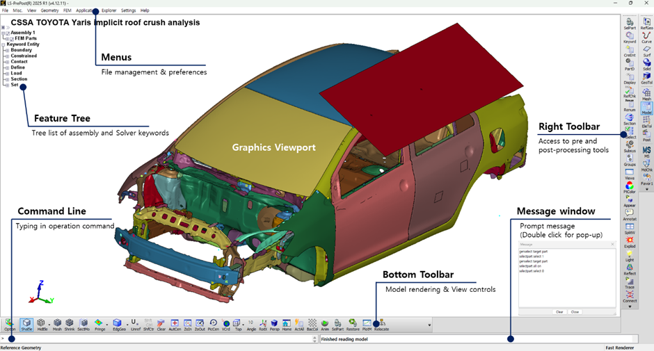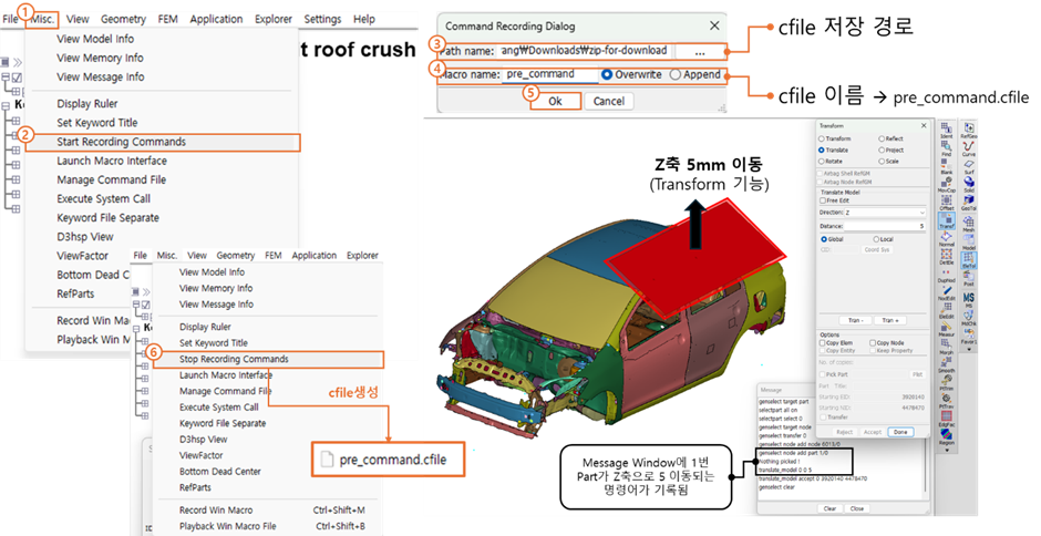 LS-Prepost에서는 GUI 상에서 기능을 실행할 때마다 해당 명령어(Command)가 Message Window창에 자동으로 기록된다. 이러한 명령어를 형식이 맞추어 메모장에 작성하여 LS-Prepost를 자동으로 실행할 수 있는 커맨드 파일 cfile을 생성할 수 있으며, 다른 방법으로는 LS-Prepost의 자체적인 Record 기능을 활용하실 수 있다.