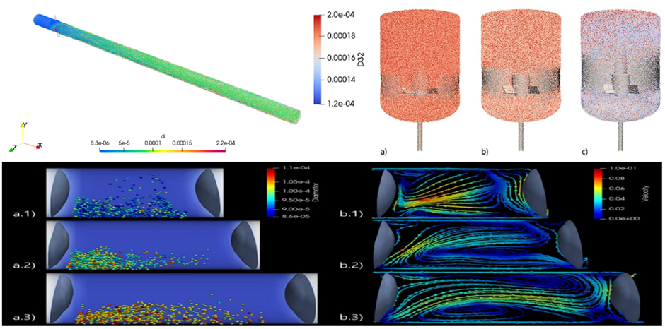 이러한 인프라와 Ansys의 비약적인 발전을 바탕으로, 저희 MPSE 연구실에서 기존 방법론의 한계를 넘어 MP-PIC-PBE 모델과 같은 고도화된 멀티스케일 유동 해석을 수치적으로 매우 안정적이고 빠르게 수행하고 있습니다. 입자의 질량, 크기, 속도 등 다양한 물리적 속성을 라그랑주(Lagrangian) 관점에서 추적하면서도 입경 분포(Particle size distribution)를 견고하게 예측할 수 있어 해석의 정확도가 크게 향상되었습니다.