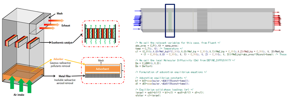 대표적인 예로, 산업용 먼지 필터 공정에서는 섬유에 입자가 접촉할 때 100% 포집된다는 기존의 결정론적 모델의 한계를 극복하기 위해, UDF를 이용해 베르누이 시행(Bernoulli trial) 기반의 확률론적 입자 포집 모델을 Ansys Fluent로 구현했습니다. 이를 통해 실제 공정과 매우 유사한 입자 분포 및 포집 위치를 예측할 수 있었습니다. 또한, 원전 중대사고를 대비한 PAR 시스템 해석에서는 Darcy의 법칙과 Bi-Langmuir 방정식에 기반한 흡착 및 표면 촉매 반응 메커니즘을 UDF와 벽면 표면 반응 모델로 구현하여, 무전원 상태에서 장비가 자가 작동(Self-operating)하는 원리를 규명하고 기기 설계를 최적화하는 데 활용하기 위한 CFD 해석 결과를 도출했습니다.