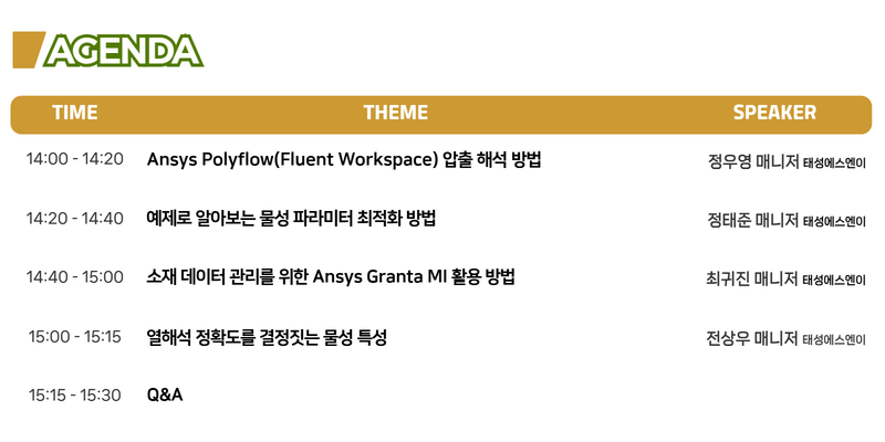 ■ 데이터로 보는 재료 물성의 모든 것 시뮬레이션 정확도를 결정짓는 핵심 중 하나는 바로 ‘재료 물성 데이터’입니다. 하지만 수많은 데이터 중 무엇을, 어떻게 적용해야 할지는 막막한 게 사실이죠. 이번 세미나에서는 Ansys Polyflow를 활용한 압출 해석부터, 물성 파라미터 최적화 방법, Ansys Granta MI 기반의 소재 데이터 관리 전략, 그리고 열해석에서 자주 사용되는 PCB 및 히트파이프 물성 고려 방법까지 실제 예제를 통해 차근차근 다룹니다. 시뮬레이션 효율을 높이고 데이터 신뢰도를 확보하고자 하는 엔지니어분들이라면 놓치지 마세요.
